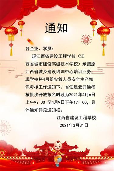 現(xiàn)江西省建設(shè)工程學(xué)校(江西省城市建設(shè)高級(jí)技術(shù)學(xué)校)承接原江西省城鄉(xiāng)建設(shè)培訓(xùn)中心培訓(xùn)業(yè)務(wù),現(xiàn)學(xué)校將4月份安管人員安全生產(chǎn)知識(shí)考核工作通知下:省住建云開(kāi)通考核批次開(kāi)放報(bào)名時(shí)段為2021年4月6日上午9:00至4月9日下午17:00,具體通知詳見(jiàn)通知欄。