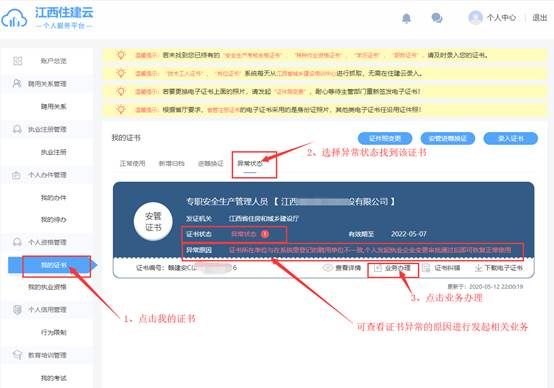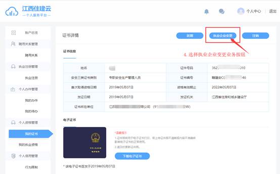 當(dāng)執(zhí)證人員因單位調(diào)動,需要辦理證書變更業(yè)務(wù)時,在“證書詳情”頁面,點(diǎn)擊“執(zhí)業(yè)企業(yè)變更”,系統(tǒng)自動檢測本人實(shí)名制認(rèn)證、上傳證件照、聘用關(guān)系登記、無在辦理業(yè)務(wù)等條件,各項條件滿足,申請單由證書所在單位確認(rèn)后才會提交至相關(guān)業(yè)務(wù)部門審查,審查完成后簽發(fā)電子證書,實(shí)現(xiàn)“一次不用跑”。操作流程:【我的證書】→【異常狀態(tài)】→【業(yè)務(wù)辦理】→【執(zhí)業(yè)企業(yè)變更】→【證書所在單位確認(rèn)】→【業(yè)務(wù)提交至主管部門審核】,如下圖: